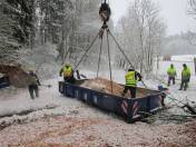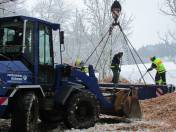 Mit Hilfe des wendigen, kleinen Radladers des THW Markt Schwaben konnte auf dem engen Terrain hinter dem Unfallzeug gearbeitet werden. Es galt, 17 Tonnen Mais in Schuttmulden zu verladen, die dann mit Hilfe eines Autokrans des Abschleppunternehmens zur weiteren Verbringung aus der Unfallstelle gehoben wurden.